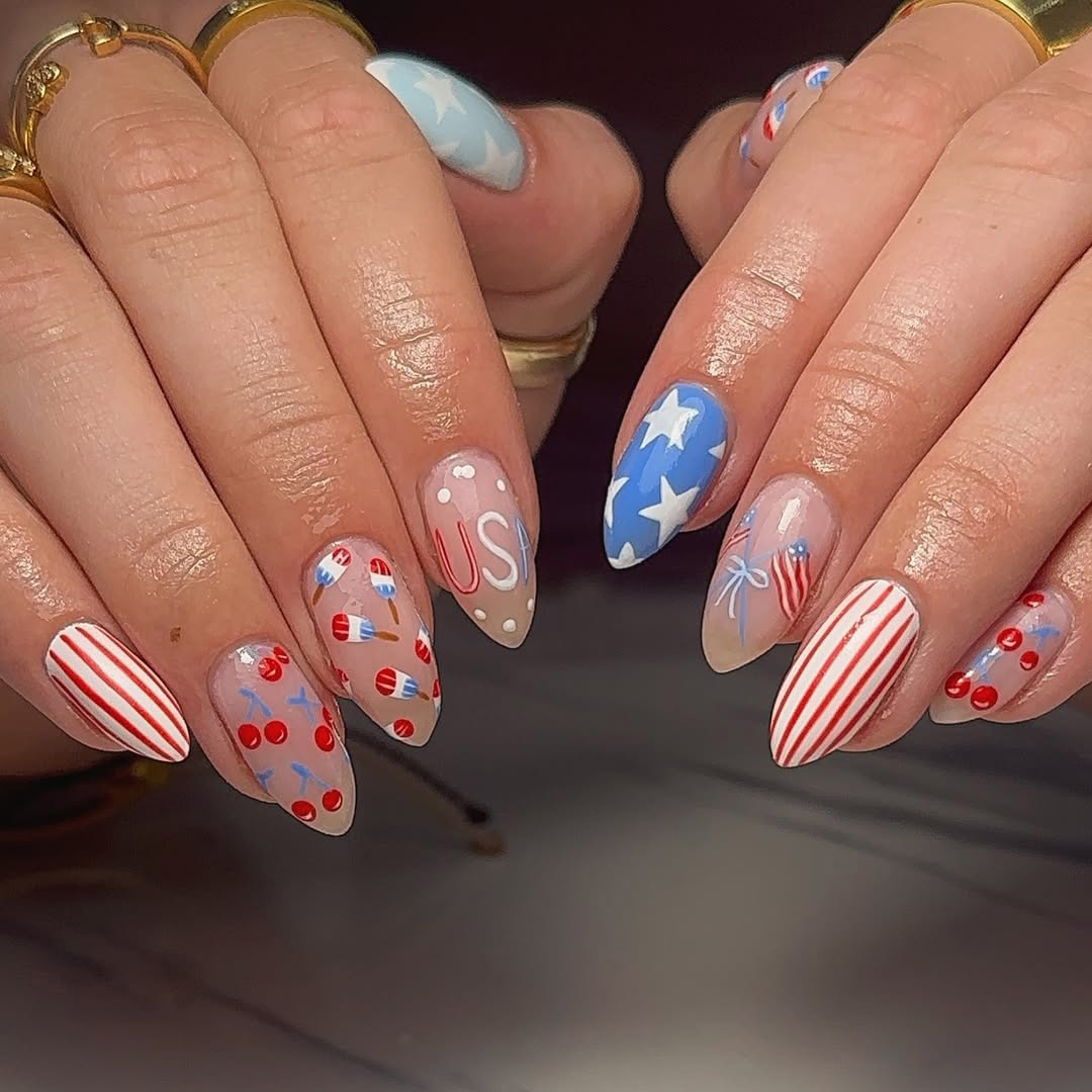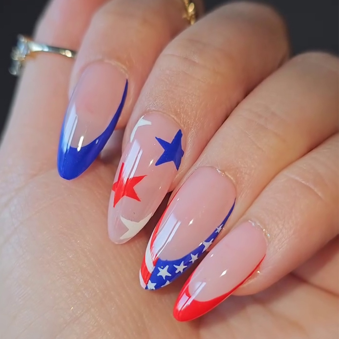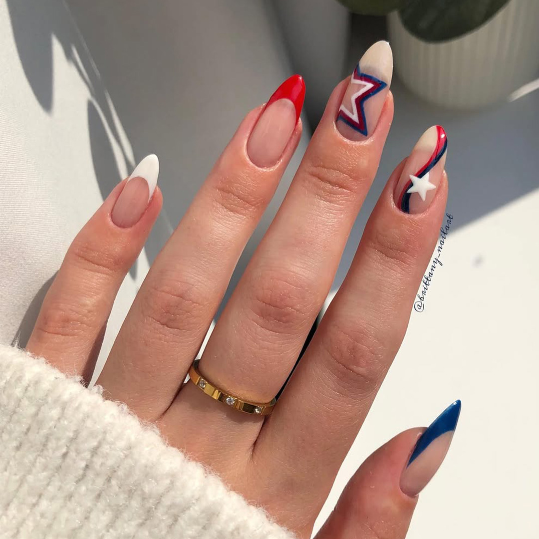 @brittany_nailart also explored the French tip route but switched things up with a mix of stars across the nails. The neutral base makes the playful pops of patriotic color stand out without feeling overdone.