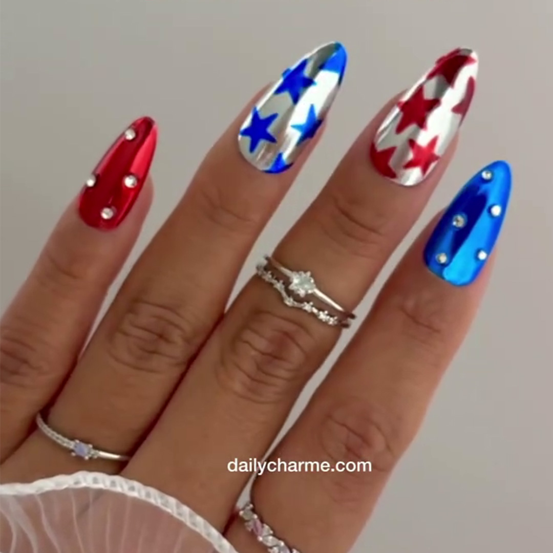@daily_charme delivered a stunning chrome masterpiece accented with stars and stones. The reflective finish adds a high-shine glam factor, while the celestial accents bring fireworks to your fingertips.