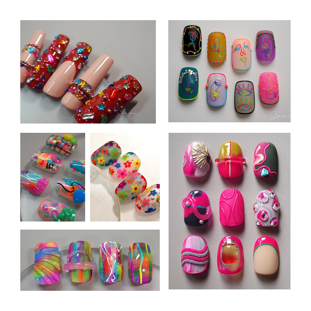 Her signature style blends pop-inspired neon nail art with refined graphic precision, an aesthetic shaped by years of observing color contrasts in both Japan and New York City.
