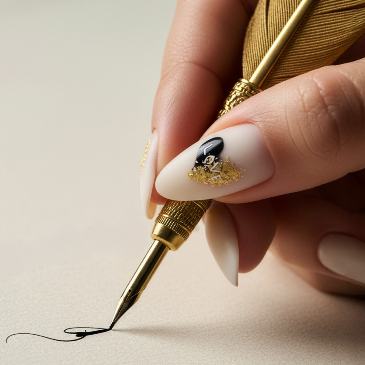 Mix one drop of top coat + white gel paint and write “LOVE.” Cure for 60 seconds.